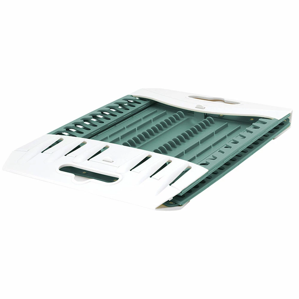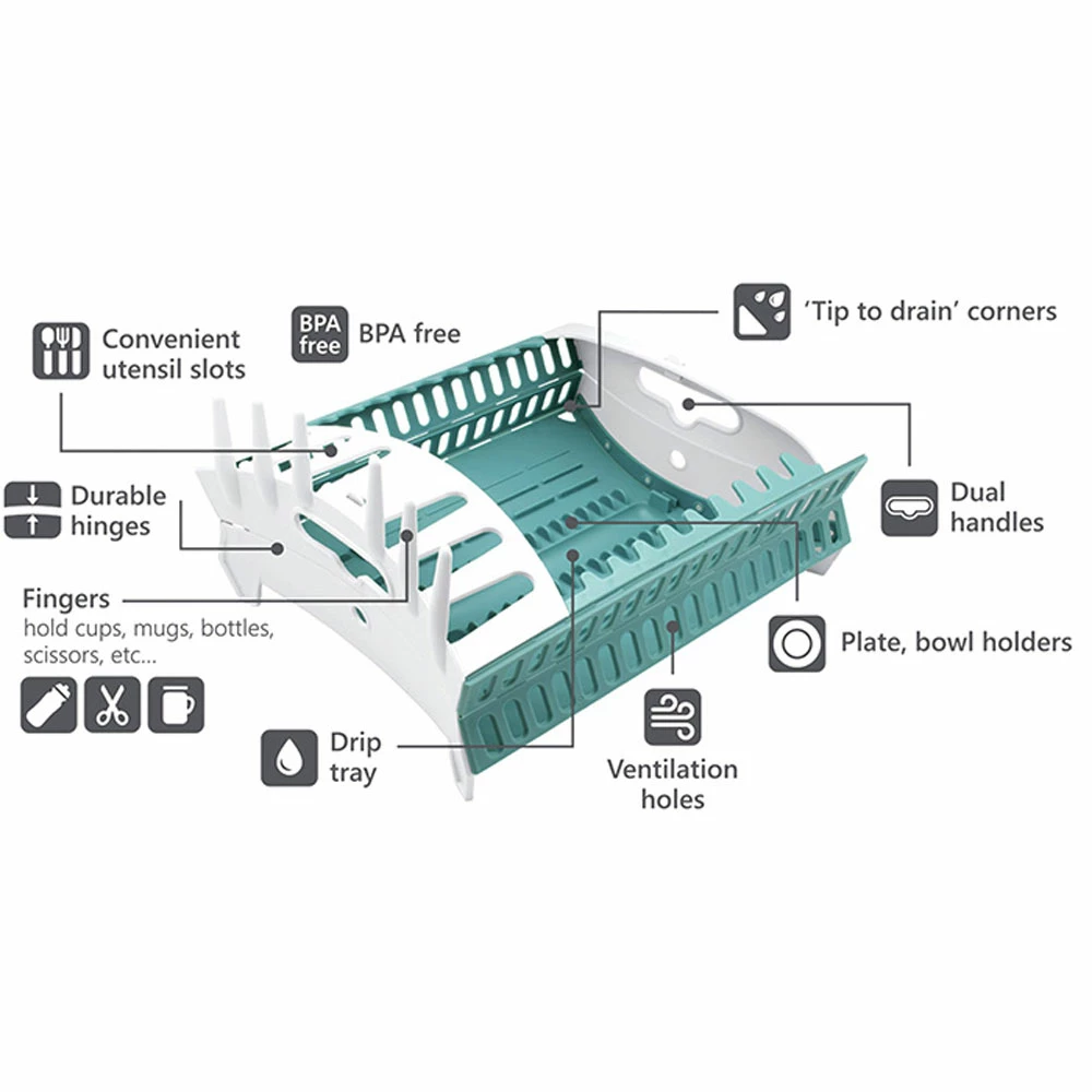 This innovative collapsible dish rack assembles quickly and easily with a gentle push on each end. Compact design but easily handles most daily needs with slots for dishes, bowls, and utensils. Includes a built-in drip tray that keeps counters dry. When not in use, it collapses flat for easy storage.
