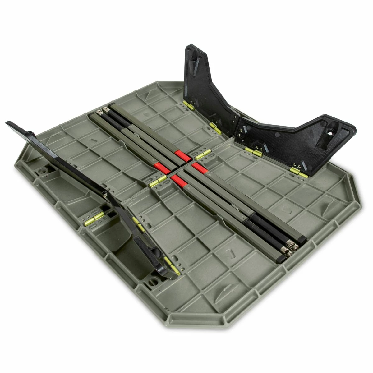Custom engineered aluminum hinges, and aluminum legs integrated with carbon fiber and zinc pole tips for a stable and supportive outdoor camp table.