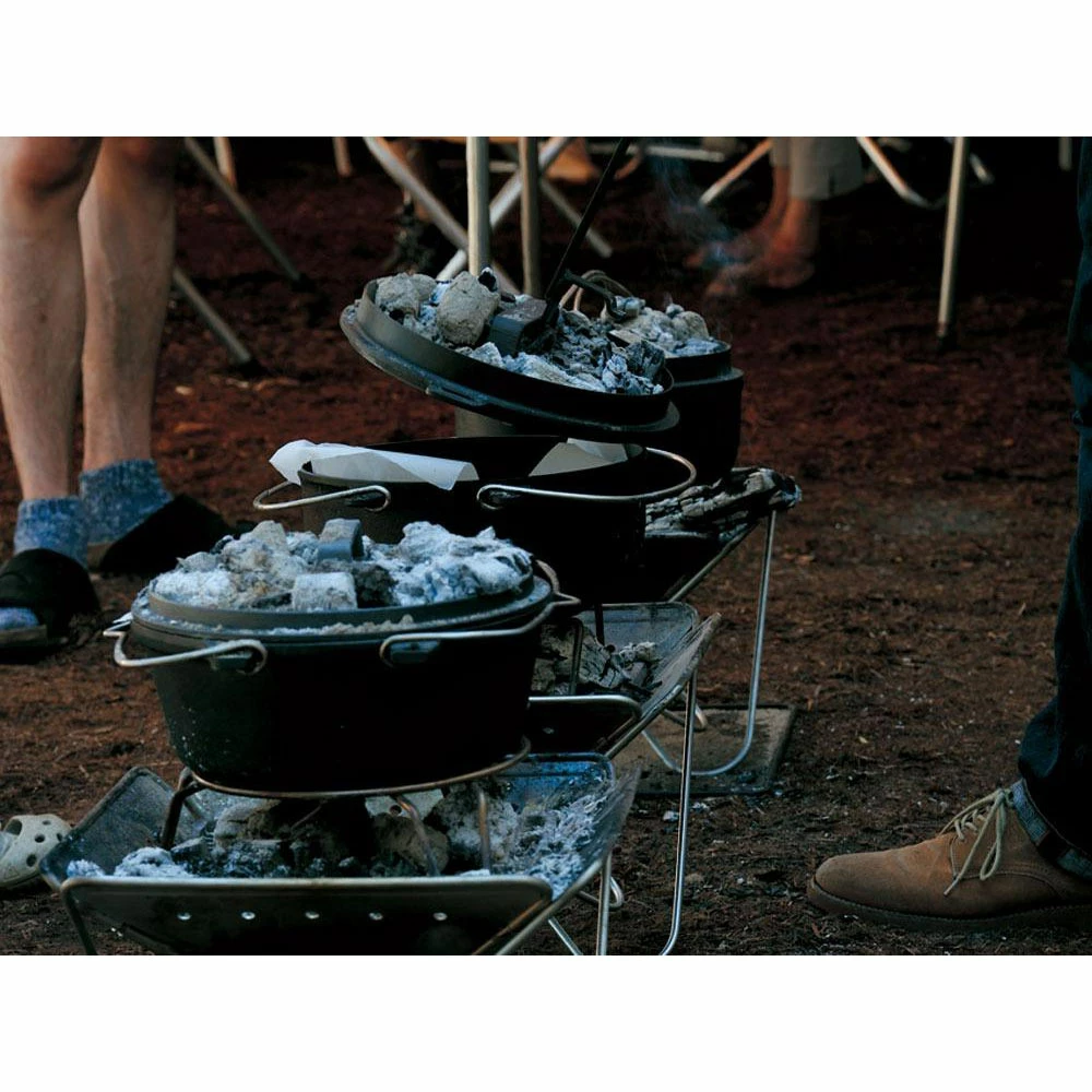 The Dutch Oven Stand 26 from Snow Peak is designed to lift the Japanese Cast Iron Oven 26 off the coals for a more controlled cooking temperature.